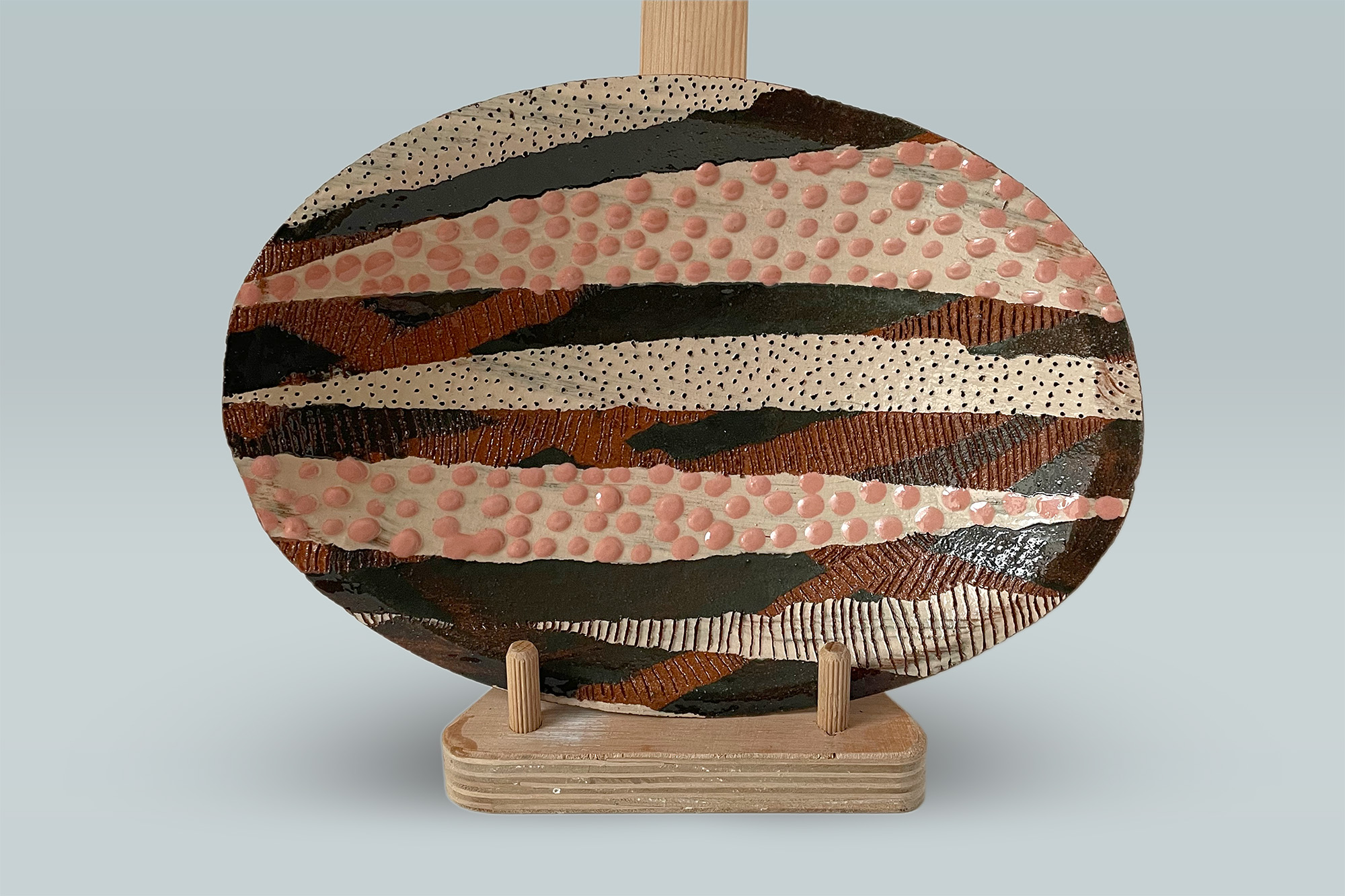 Rivers, a canal and streams flow through Oxford. Ceramics named fishes, towpath and puddles, first shown at ‘Watermarks’ an exhibition at Radley College, Oxford, 2026, reflect this watery environment.
