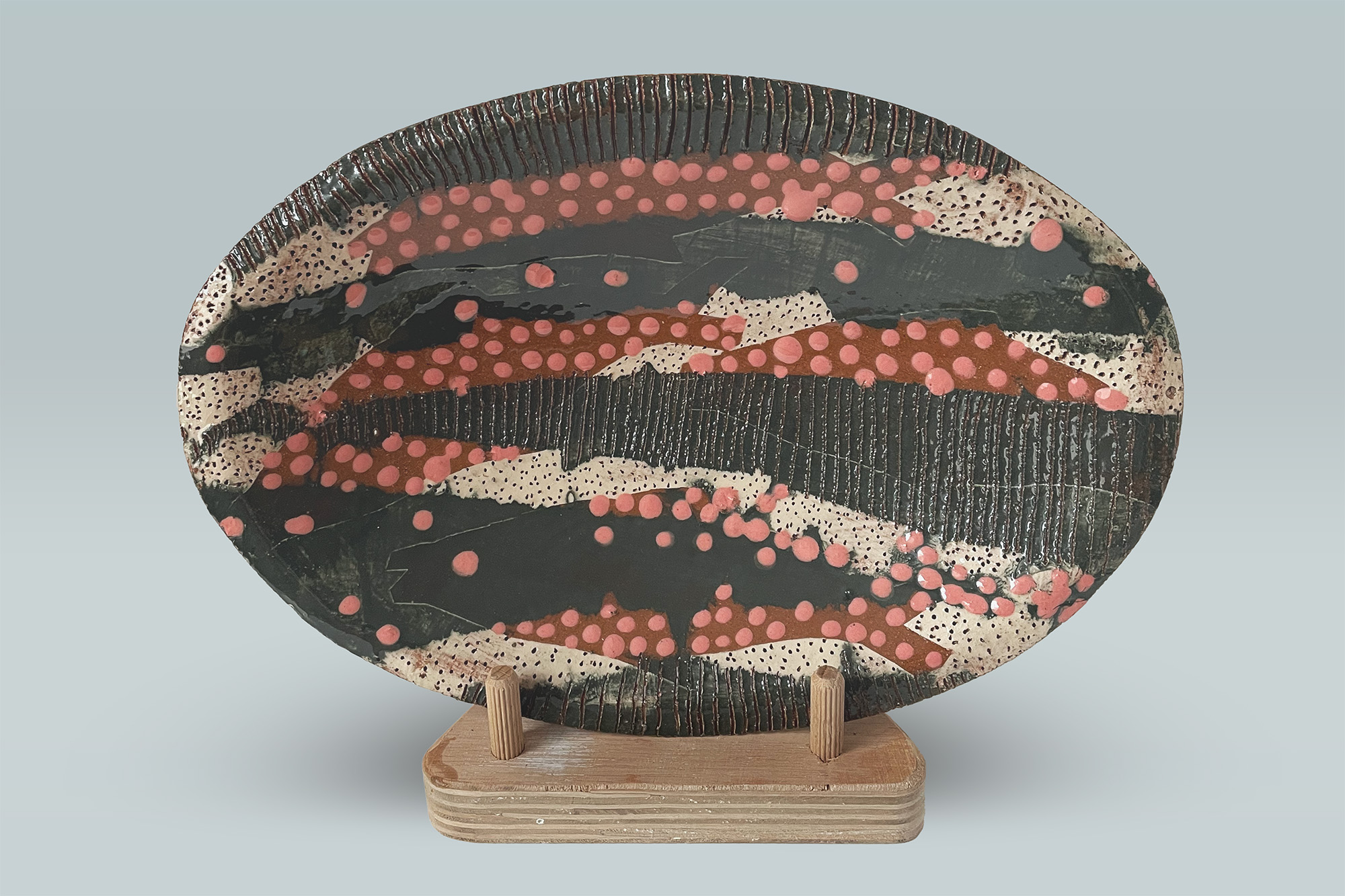 Rivers, a canal and streams flow through Oxford. Ceramics named fishes, towpath and puddles, first shown at ‘Watermarks’ an exhibition at Radley College, Oxford, 2026, reflect this watery environment.