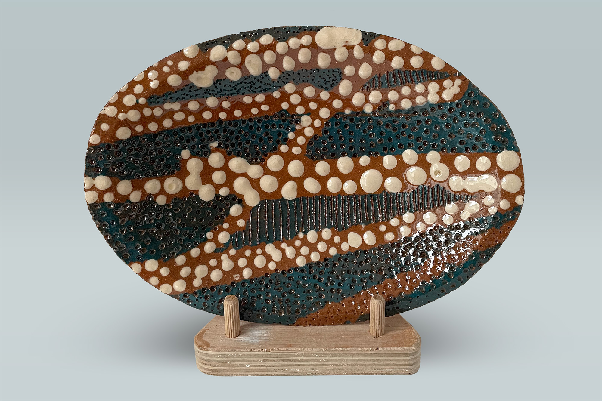 Rivers, a canal and streams flow through Oxford. Ceramics named fishes, towpath and puddles, first shown at ‘Watermarks’ an exhibition at Radley College, Oxford, 2026, reflect this watery environment.